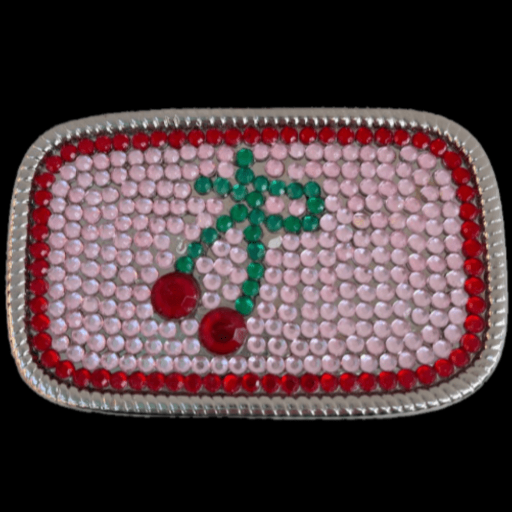 Cherry-themed belt buckle featuring red and pink rhinestones for a playful, feminine touch. A charming accessory that adds vibrant personality to your everyday look.